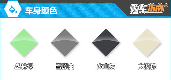 车身颜色方面,新车提供了雪原白、丛林绿、火山灰、大漠棕共四种车色。其中,丛林绿车身颜色非常值得推荐,其与整车越野套件搭配起来非常有活力。