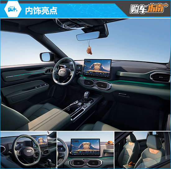 内饰方面,14.6英寸的中控屏和8.8英寸液晶仪表为驾驶者带来了便捷的操作体验,也提升了整车的科技感。座椅采用皮质、牛仔、仿麂皮面料拼搭设计,既体现了独特的设计风格,又保证了乘坐舒适度。其中,主副驾座椅还拥有Born Free标识,体现自由潮流的牛仔气息。