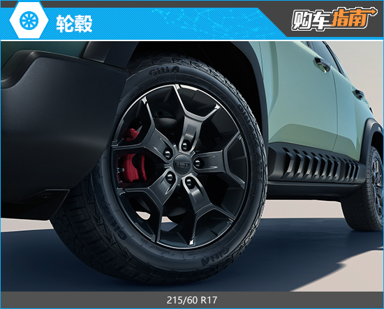轮毂方面,吉利牛仔全系标配18英寸轮毂,轮胎规格为215/55 R18。除此之外,官方还为高配车型推出了“趣野AT胎套装”选装包,包含17英寸越野轮毂、17英寸越野AT胎以及红色卡钳,17英寸越野AT胎的规格为215/60 R17。