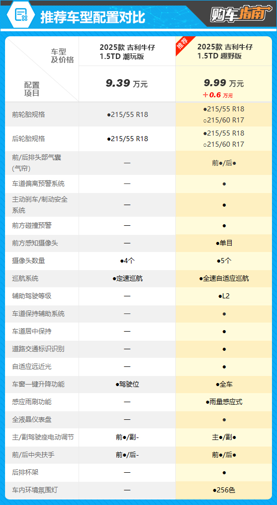本次推荐的是售价9.99万元(限时优享价为9.59万元)的趣野版。通过配置对比可以看出,推荐车型相比入门车型增加了丰富的主/被动安全配置,包含前/后排头部气囊、车道偏离预警系统、主动刹车/制动安全系统等。更重要的是驾驶辅助等级也达到了L2,无论是城市驾驶还是长途出行,都可以让驾驶体验更加轻松、安全。