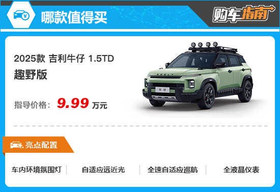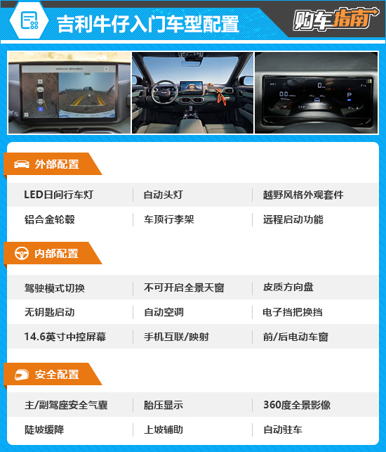 吉利牛仔入门车型为潮玩版,售价为9.39万元(限时优享价为8.99万元)。从配置表可以看出,LED日间行车灯、自动头灯、铝合金轮毂、14.6英寸中控屏幕、主/副驾驶座安全气囊以及360度全景影像等都有配备,整体配置还是非常丰富的,不过入门版本并不是本次主推的车型,因为还有性价比更高的选择。