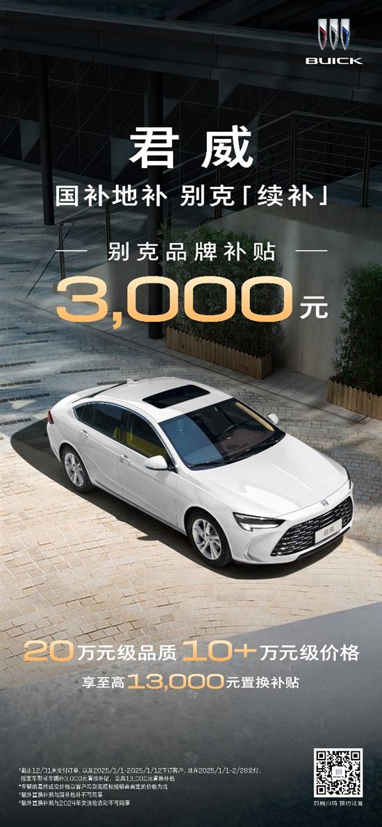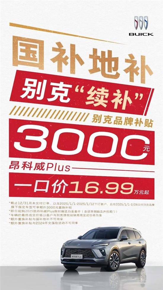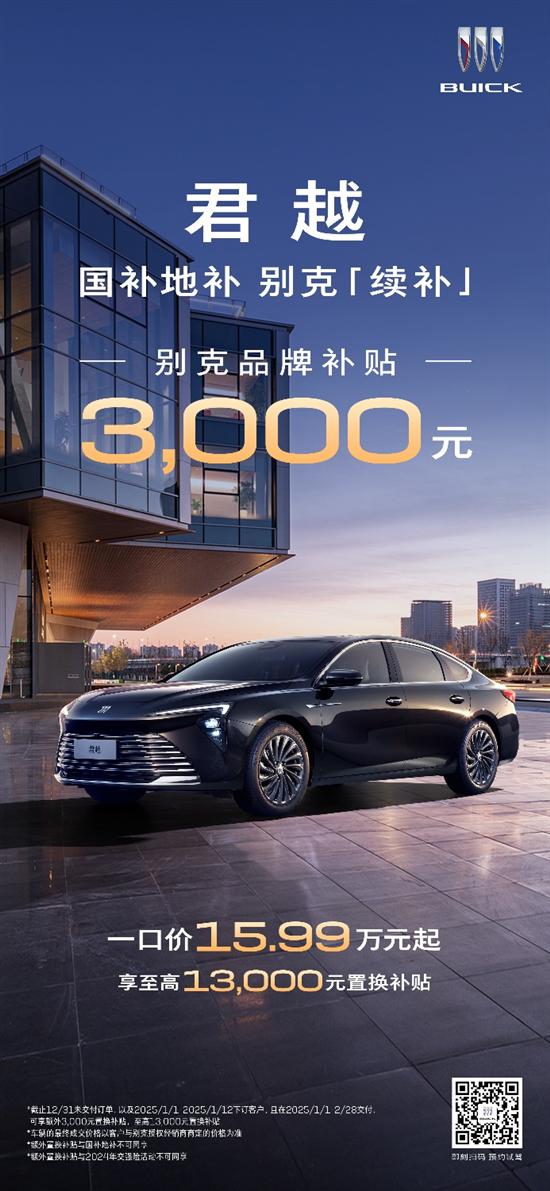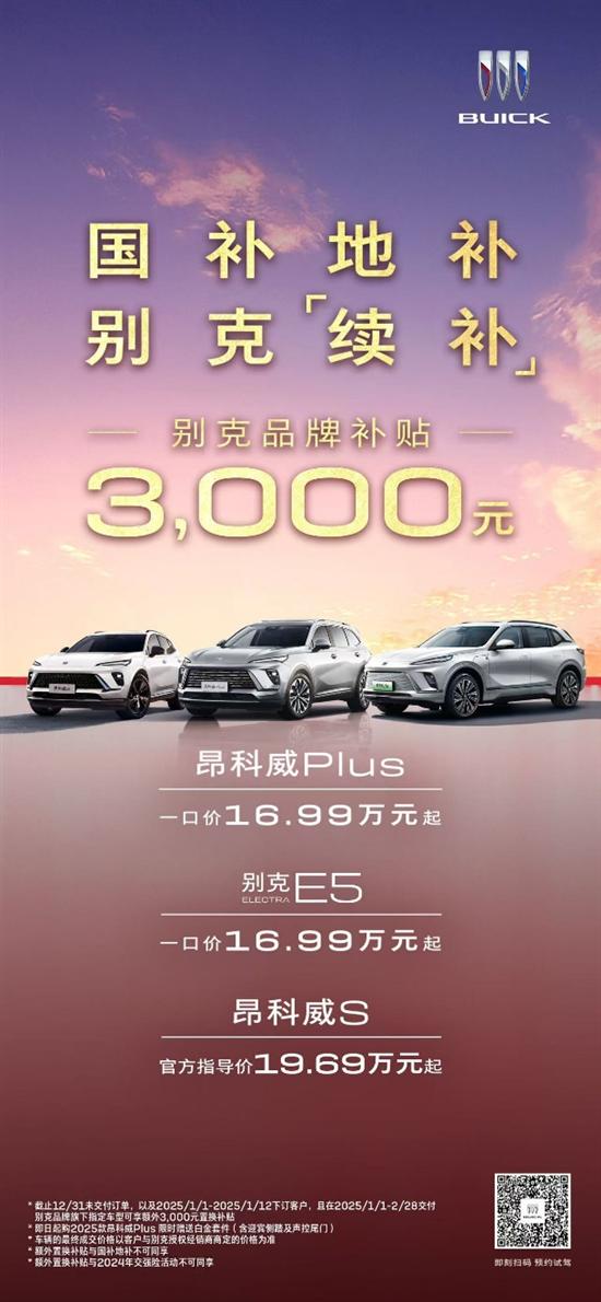 新年在即,别克又送新福利。针对新一年汽车置换国补地补退坡,别克为消费者“续补”:对于已经购买别克君越、君威、昂科威Plus、昂科威S、别克E5、昂科旗车型,但未在12月内交付的用户,以及在2025年1月12日(含12日)之前下订的新用户,别克品牌将在车型原有的置换政策之上,额外提供3,000元置换补贴。此举将打消用户因车源供不应求、提车周期较长而错过补贴窗口,或因年底前来不及购车而无法享受政府置换补贴的后顾之忧,体现别克对用户的满满诚意。