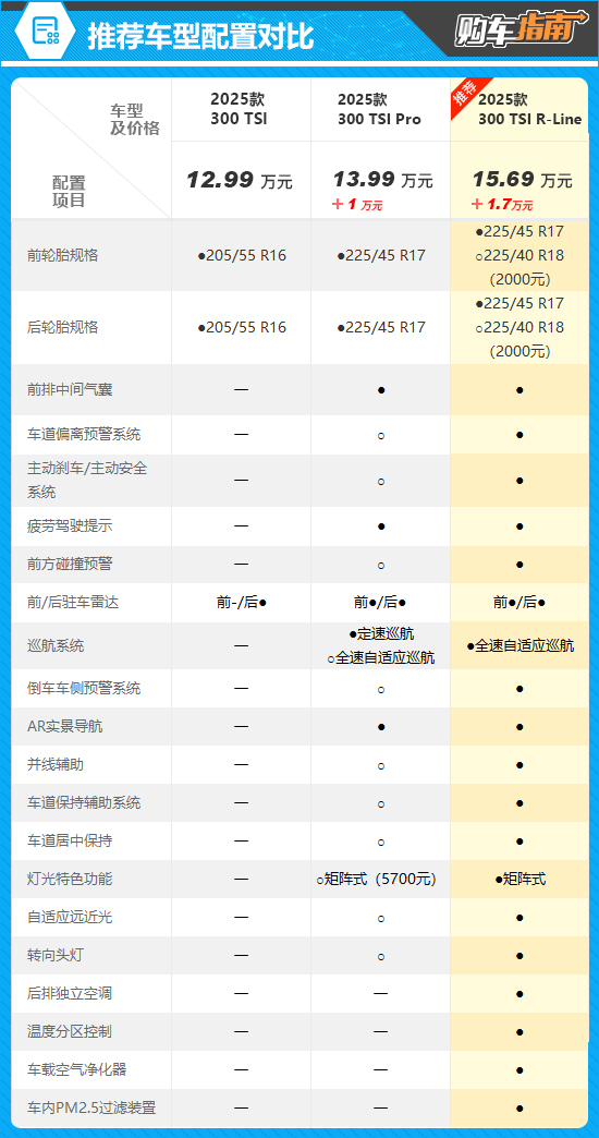 本次推荐的是售价为15.69万元的300 TSI R-Line版,即全系顶配车型。通过对比配置不难发现,推荐车型相比低一个级别的车型,无论舒适性、被动安全配置还是驾驶功能配置都更加丰富,如后排独立空调、车载空气净化器、温度分区控制、前方碰撞预警、倒车车侧预警系统、并线辅助以及全速自适应巡航等。这些配置的提升只需多花费1.7万元便可实现,可谓是物超所值。