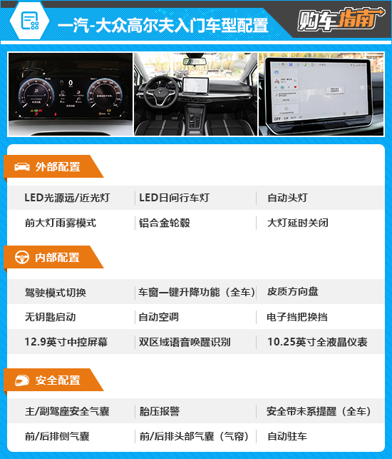 新款高尔夫入门车型的配置比较丰富,从配置表可以看出,如LED光源远/近光灯、LED日间行车灯、自动头灯、12.9英寸中控屏幕以及10.25英寸全液晶仪表等都有配备。这些功能满足基础家用是没问题的。而此次没有推荐入门版,主要是因为还有性价比更高的车型。