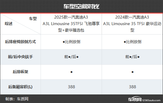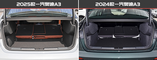 新老款一汽奥迪A3后备厢整体表现一致,地台十分平整,后排座椅均支持比例放倒,后备厢容积也都为388L,日常使用尚可。