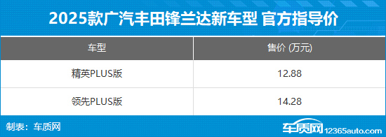 2025年1月1日,广汽丰田官方宣布,2025款锋兰达推出精英PLUS版和领先PLUS版两款新车型,售价分别为12.88万元和14.28万元。相比在售的精英版和领先版车型,新车主要针对座椅材质和内部装饰进行了升级。