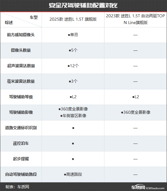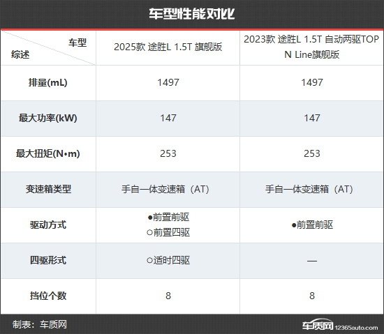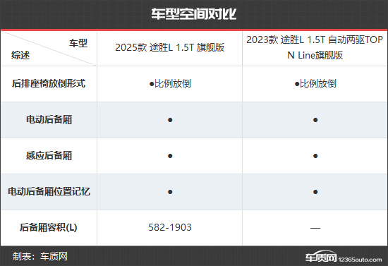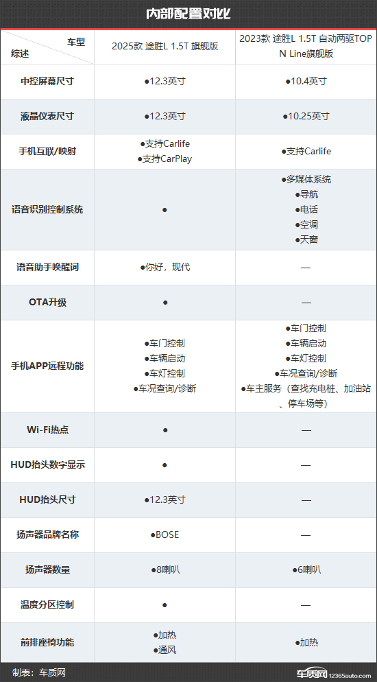 2025款北京现代途胜L共推出4款车型,售价区间15.98-20.78万元。与2023款北京现代途胜L相比,起售价和最高售价均有所降低。除此之外,新款车型数量也有所精简。为了直观对比,我们选取2025款 途胜L 1.5T 旗舰版和2023款 途胜L 1.5T 自动两驱TOP N Line旗舰版进行比较,以便更加直观地看出新老款车型的具体变化。(注:由于2025款 途胜L 1.5T 旗舰版和2023款 途胜L 1.5T 自动两驱TOP N Line旗舰版图片缺失,本文以2025款 途胜L 1.5T 尊贵版和2023款 途胜L 1.5T 自动两驱GLX精英版替代,仅供参考)