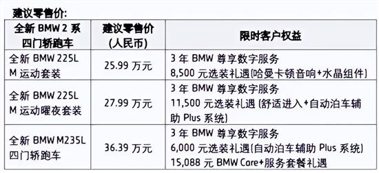 1月2日,车质网从官方获悉,全新宝马2系四门版正式上市,新车推出3款车型,售价区间25.99-36.39万元。该车是华晨宝马首款国产四门轿跑车型,新车为紧凑型豪华四门轿跑车细分市场注入了宝马独有的纯粹驾驶乐趣。