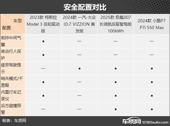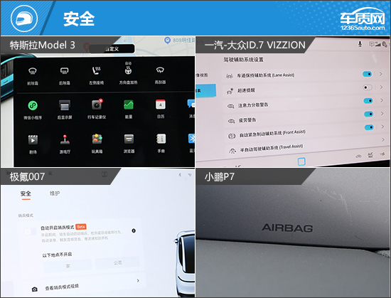 安全配置方面,特斯拉Model 3、极氪007以及小鹏P7均表现不错,三款车型均提供哨兵模式/千里眼和内置行车记录仪功能,进一步保障行车安全。其中,特斯拉Model 3还配备了独有的前排中间气囊和被动行人保护功能。相比之下,大众ID.7的安全配置表现一般。