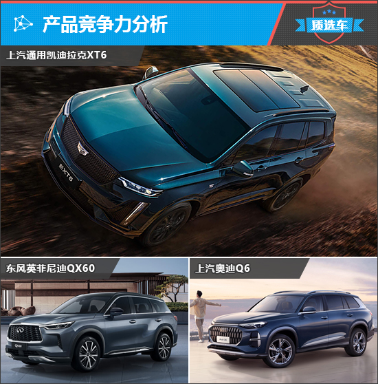 在凯迪拉克新XT6所在的细分市场,消费者的可选车型并不是很多,综合考虑价格、空间和产品特点,为2025款上汽通用凯迪拉克XT6(下文简称凯迪拉克XT6)挑选了两款竞品车型,分别为2024款东风英菲尼迪QX60(下文简称英菲尼迪QX60)和2024款上汽奥迪Q6(下文简称奥迪Q6)。