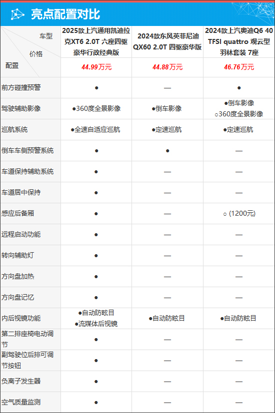 具体到车辆配置层面,我们选择了售价相差不大的三款车型进行对比。配置方面,凯迪拉克XT6独享多项驾驶功能、舒适性配置,如全速自适应巡航、车道保持辅助系统、方向盘加热等,用车体验更好。相比之下,另外两款车型在驾驶功能配置方面缺少较多,整体表现一般。综合来看,凯迪拉克XT6在配置层面更加丰富,相比英菲尼迪QX60和奥迪Q6要占据明显优势。