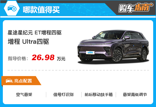 星途星纪元 ET增程四驱的入门级车型是增程 Max四驱,厂商指导价23.98万元。虽然是入门级车型,但整体表现并不算差,像前排中间气囊、前/后排头部气囊(气帘)、远程启动功能、第二排座椅电动调节、自动空调、前排手机无线充电等安全性、便利性和舒适性配置均有所配备。之所以没有推荐入门级车型,主要原因在于还有性价比更高、性能表现更好的车型。
