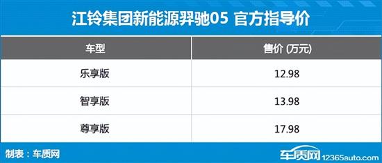 1月13日,江铃集团新能源羿驰05正式上市,新车共推出3款车型,售价区间为12.98-17.98万元。此外,即日起至2月28日下订,还可享受购车直降礼、置换金融礼、充电无忧礼等多重购车权益。