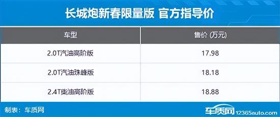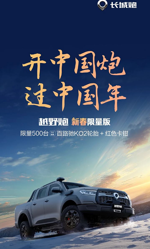 1月15日,长城越野炮新春限量版正式上市,新车推出3款车型,售价区间17.98-18.88万元。越野炮新春限量版仅限量发售500台,消费者支付9.9元定金即可享受百路驰KO2轮胎和红色卡钳。