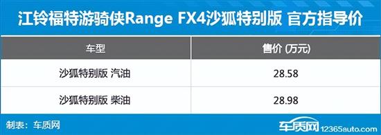1月15日,江铃福特游骑侠Range FX4沙狐特别版正式上市,新车共推出2款车型,官方售价区间为28.58-28.98万元。同时,官方还推出纵横山野礼、购车金融礼、限时置换礼等6项购车权益。