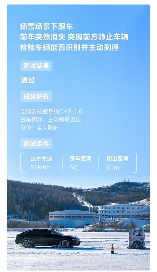 而在2024中汽中心牙克石极寒测试,在扬雪场景下跟车,前车突然消失且突现前方静止车辆的测试中,标配全向防碰撞系统CAS3.0的享界S9成功识别并主动刹停, 成功通过测试。