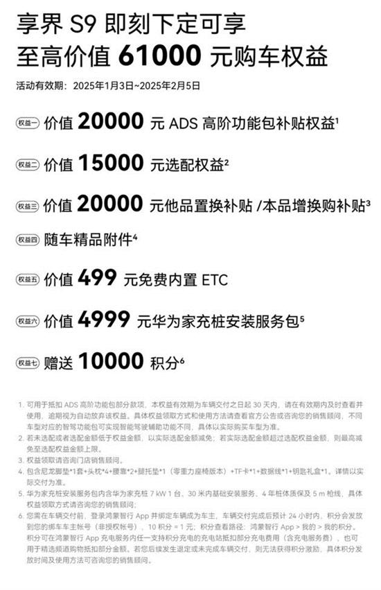 对于有置换需求的车主来说,享界S9的20000元置换补贴更是吸引力十足。同时,15000元的选配权益让消费者可以自由定制自己的专属豪华座驾,从外饰、内饰、后排零重力座椅到影院级娱乐配置,每一项选择都能让新年旅程更添舒适与乐趣。此外,享界S9还贴心赠送了价值499元内置ETC、价值4999元的华为家充桩安装服务、10000积分以及脚垫、头枕、腰靠等精品附件,进一步优化用户的日常用车体验。这些实实在在的政策,既满足了消费者对价格的期待,也为返乡旅程增添了一份轻松感。