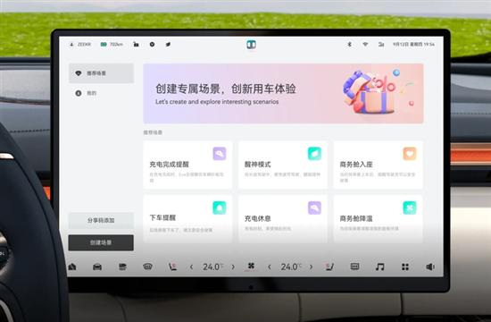 极氪MIX最为亮眼的设计之一便是乘坐体验,极氪MIX是首发量产搭载主副驾270°电动旋转座椅的车型,实现车内乘客对坐,配合可移动的桌板,营造出十分温馨的车内体验。并且,新车还支持外接PAD互联,9+N空间场景模式,包括宝宝模式、观景模式、欢聚模式等,进一步提升了娱乐性。