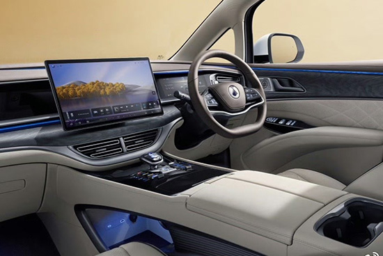 内饰方面,DENZA D9采用了“T”字形布局,整体风格十分简约。而双色内饰配色搭配大面积皮质材料的运用,豪华感营造得颇为出色。配置方面,DENZA D9搭载10.25英寸全液晶仪表以及一块15.6英寸的中控多媒体大屏,内部集成腾势Link超智能交互系统。