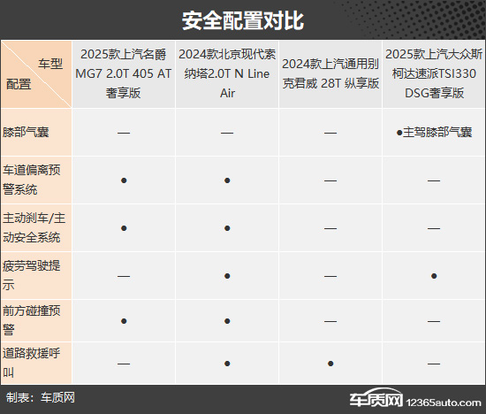 安全配置方面,现代索纳塔综合表现要好于其他三款车型,配备了疲劳驾驶提示、车道偏离预警系统、前方碰撞预警等;斯柯达速派独享主驾膝部气囊,在被动安全配置方面要优于另外三款车型。相比之下,别克君威的表现要略显逊色,在主动安全配置层面缺失较多。