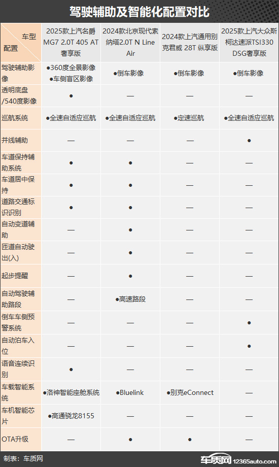 驾驶辅助配置方面,现代索纳塔展现出韩系品牌性价比高的优势,配置丰富程度要明显好于其他三款车型,独享自动变道辅助、匝道自动驶出(入)、高速路段自动驾驶辅助和起步提醒。相比之下,别克君威要略显逊色,是四款车型中唯一仅配备定速巡航系统的车型。