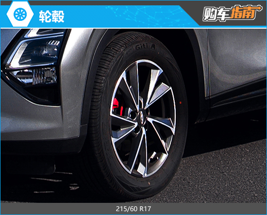 新车全系标配17英寸铝合金轮毂,轮胎规格为215/60 R17。轮毂采用时下颇为流行的“刀锋式”造型设计,除入门版车型外均配备红色刹车卡钳,这点对于年轻消费者来说确实极具吸引力。