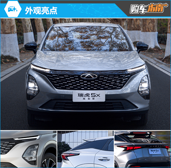 外观方面,奇瑞瑞虎5x高能版的前脸设计极具视觉冲击力,窄条状LED日间行车灯与点阵式倒梯形中网融为一体,两侧配备内嵌式大灯组,整体造型犀利动感且个性前卫。车侧的分段式腰线充满运动势能,尾部区域更是立体感十足,再加上悬浮式车顶元素,营造出很强的运动气息。尾灯组点亮效果十分出色,高位刹车灯集成在尾翼末端,能够起到很好的警示作用。尺寸方面,新车长宽高分别为4400mm*1830mm*1588mm,轴距为2630mm。