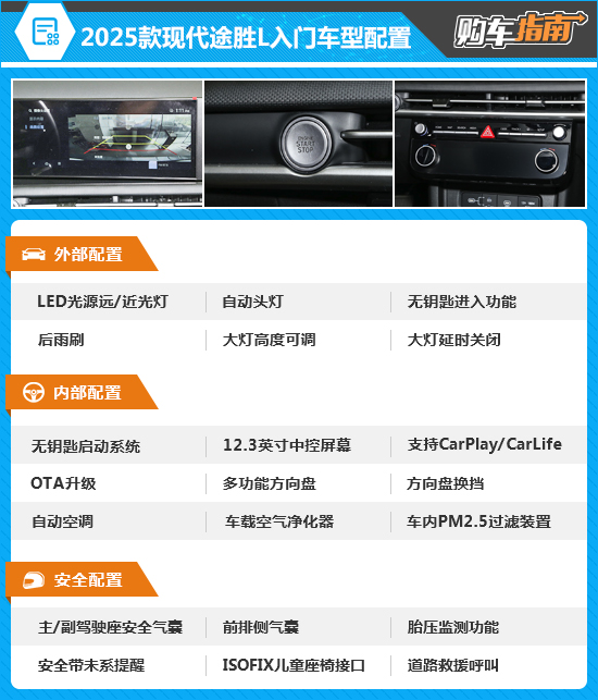 2025款北京现代途胜L入门车型提供了比较丰富的基础配置,如无钥匙进入/启动、自动头灯、手机互联功能以及自动空调等均有配备,但主动安全和便捷性功能缺失明显,所以此次并不推荐。