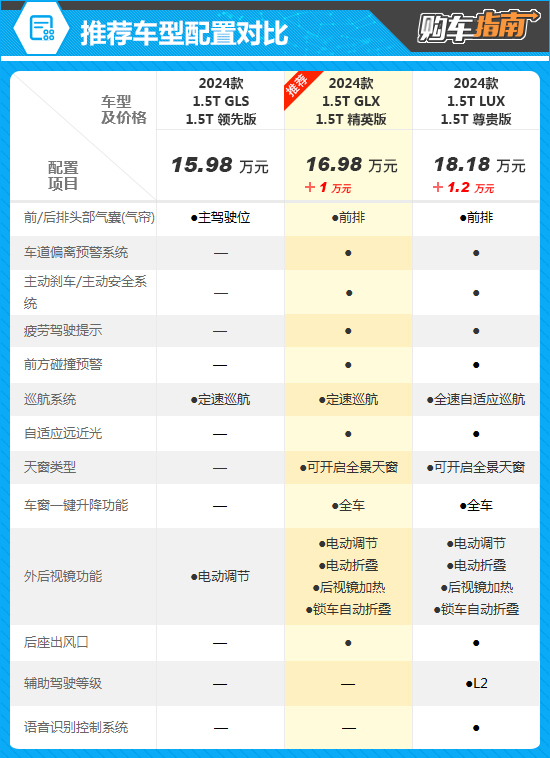 通过对比配置不难发现,推荐车型比入门版本增加了车道偏离预警系统、主动刹车/主动安全系统、前方碰撞预警、自适应远近光以及可开启全景天窗等功能,对于日常用车体验提升显著,能够值回两者之间1万元的差价,推荐升级。