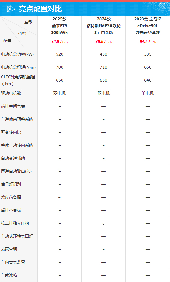 具体到车辆配置层面,通过对比来看,蔚来ET9和路特斯EMEYA繁花搭载双电机,并且CLTC纯电续航里程一致,均为650km。宝马i7略逊一筹,仅搭载单电机,CLTC纯电续航里程为640km。而在智能化、舒适性配置和辅助驾驶功能等方面,蔚来ET9有着绝对优势,相比之下,宝马i7参与对比的车型虽然价格高于另外两款车型,但配置缺失明显,表现一般。