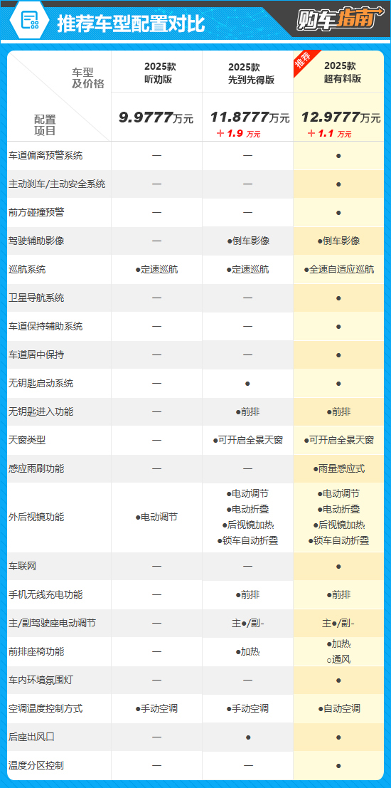 综合配置及价格来看,对于2025款捷达VA7的购买建议,个人推荐厂商指导价为12.9777万元的超有料版。推荐车型相比低一级别车型在驾驶功能、主动安全和舒适性方面有进一步提升,如新增车道保持辅助系统、车道偏离预警系统、前方碰撞预警、温度分区控制等,用车体验更好且售价仅增加1.1万元,绝对是物有所值。