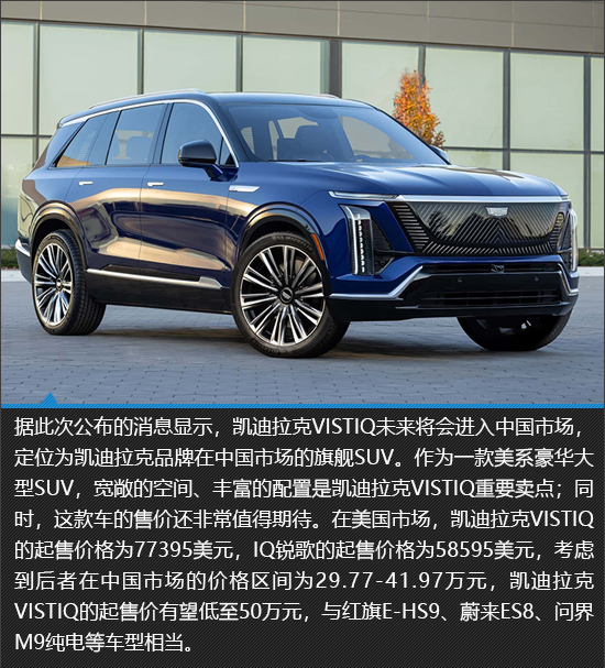 从目前的情况来看,电动化已经成为车市一个不可逆的趋势,即便是豪华品牌也在加快推出纯电车型的步伐。在美系豪华品牌中,凯迪拉克的电动化步伐较快,即便是在大型SUV市场,也推出了电动化产品。凯迪拉克VISTIQ是品牌布局纯电动SUV市场的全新车型,虽然与凯雷德ESCALADE IQ同为大型SUV,但定位要略低一些。按照计划,凯迪拉克VISTIQ将会进入中国市场。