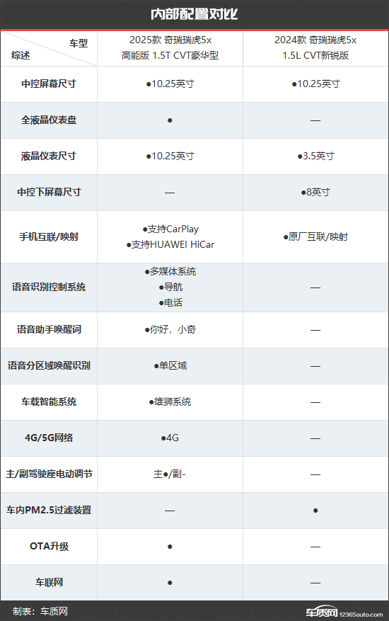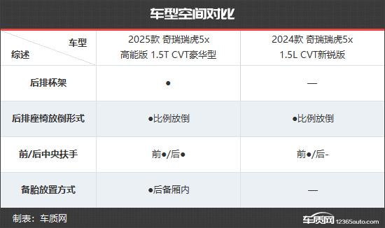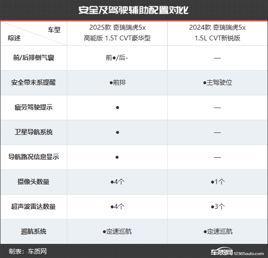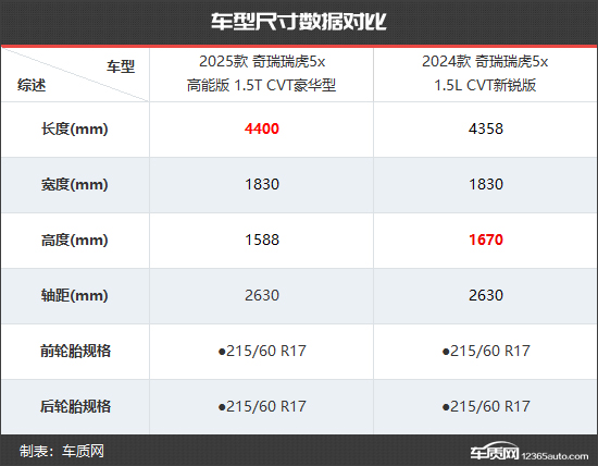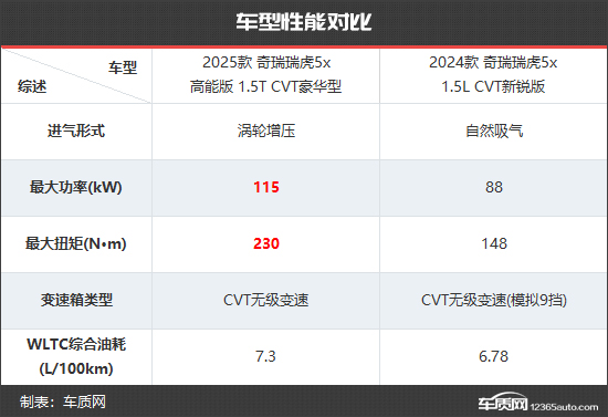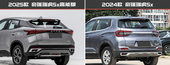 2025款奇瑞瑞虎5x高能版(以下简称:瑞虎5x高能版)共推出3款车型,售价区间6.99-8.39万元。与老款车型相比,起售价有所提升,顶配车型售价降低不少。为了直观对比,我们选取2025款奇瑞瑞虎5x高能版1.5T CVT豪华型和2024款奇瑞瑞虎5x 1.5L CVT新锐版进行比较,以便更加直观地看出新老款车型的具体变化。(由于目前图片数量较少,因此老款车型的图片有些并不是相对应的具体款型)