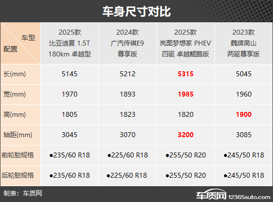 车身尺寸方面,梦想家表现最为突出,在车身长度、车身宽度及轴距方面保持领先,确保了车内乘客的腿部空间及横向空间足够宽敞。魏牌高山在车身高度上优势明显,1900mm的车身高度可充分保证车内乘客的头部空间,即使长途行驶也不会有过多的压抑感。相比之下,比亚迪夏和传祺E9的表现旗鼓相当,没有突出的亮点。此外,只有梦想家配备了20英寸轮毂,视觉观感要好于其他三款车型。