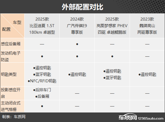 外部配置方面,比亚迪夏在四款车型中表现相对较好,独享后排车门/后备厢投影感应开启及主动闭合式进气格栅,并提供多种钥匙类型,日常使用十分便捷。相比之下,魏牌高山在外部配置方面表现一般,存在一定缺失。