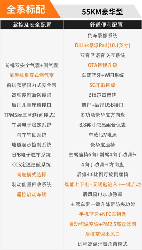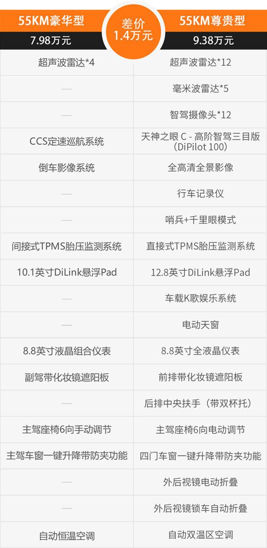 对于购买入门版(也就是55KM豪华型)的用户而言,价格敏感是放在首位的影响因素,价格低并不意味着配置就真的低,从上面的列表也能看出其提供了多少实用的高价值功能(这还是尽量合并主要功能之后的结果),满足日常的出行需求已经完全不是问题。如果您对高阶智驾功能的需求不大,需要严格控制购车总成本的话,55KM豪华型就已经是性价比很高的选择。