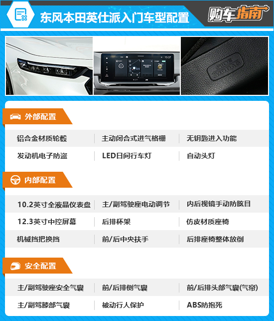 2025款东风本田英仕派的入门版车型为260TURBRO 典雅版,指导价为18.28万元。如LED日间行车灯、主动闭合式进气格栅、12.3英寸中控屏幕、主/副驾膝部气囊等均有配备,但舒适性及便利性配置缺少较多,因此不作推荐。