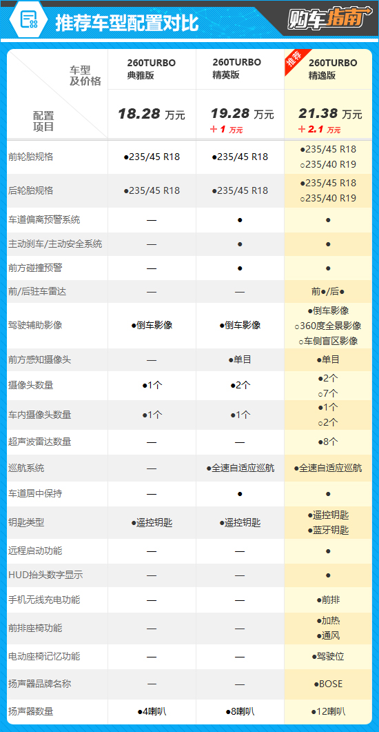 本次推荐的是售价21.38万元的260TURBRO 精逸版,通过配置对比可以看出,推荐车型相比低一级别车型在安全性、用车舒适性及便利性方面有所提升,如新增前/后驻车雷达、远程启动功能、前排座椅加热/通风等。虽然价格增加2.1万元,但新增配置绝对物超所值,能带来更好的用车体验。