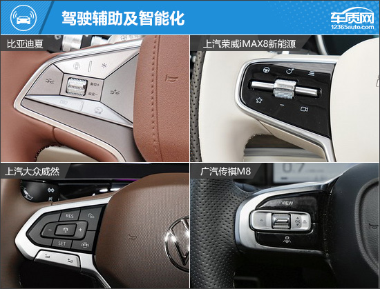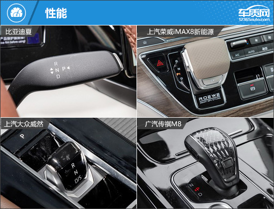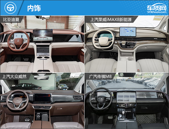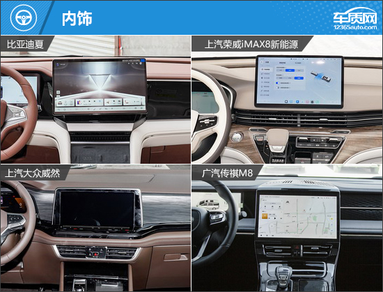 由于四款车型都是出自于传统车企,因此在内饰设计方面,都没有盲目追求标新立异,而是更注重用车的实际体验。除传祺M8之外,另外三款车型的中控显示屏为悬浮式设计;传祺M8的中控显示屏与换挡区域、中央扶手区域采用一体式设计,内饰的整体感更强。换挡形式方面,比亚迪夏采用电子式怀挡换挡,另外三款车型则是采用电子挡把换挡。其中,大众威然的挡把造型非常小巧,看起来更精致;传祺M8和荣威iMAX8则是采用较为传统的样式。