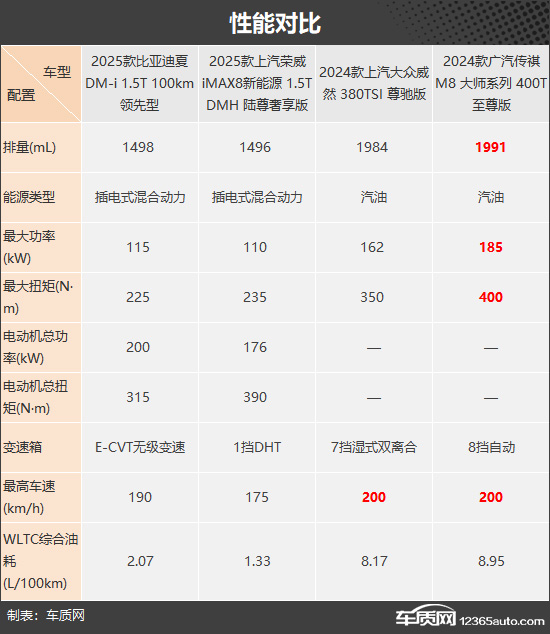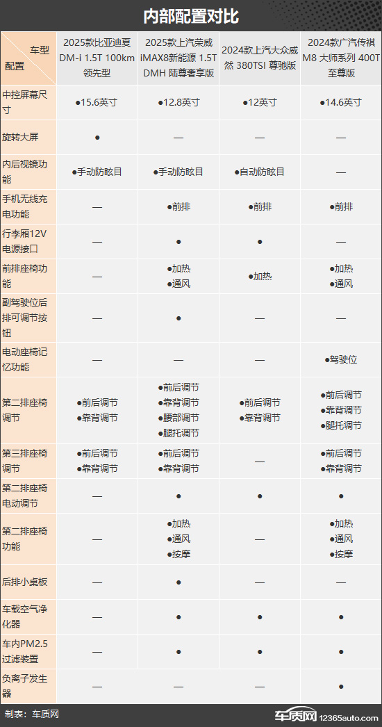 此次我们推荐的四款车型分别是2025款比亚迪夏DM-i 1.5T 100km 领先型(以下简称:比亚迪夏)、2025款上汽荣威iMAX8新能源 1.5T DMH 陆尊奢享版(以下简称:荣威iMAX8)、2024款上汽大众威然 380TSI 尊驰版(以下简称:大众威然)和2024款广汽传祺M8 大师系列 400T 至尊版(以下简称:传祺M8)。四款车型均定位为中大型MPV,且可以满足目标客户的多方面需求。(由于目前图片数量较少,因此部分车型的图片并不是相对应的具体款型)