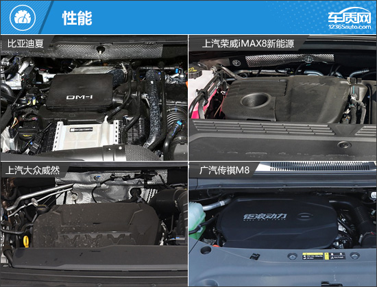 动力方面,四款车型在能源类型方面有所不同,比亚迪夏和荣威iMAX8为插电式混合动力,大众威然和传祺M8为汽油。从参数上来看,传祺M8的发动机最大功率、最大扭矩最为出众。燃油经济性方面,采用插电式混合动力系统的荣威iMAX8表现更好,WLTC综合油耗仅为1.33L/100km,是四款车型中最低的;同时,因为有电动机的辅助,其低速动力响应也会更好。