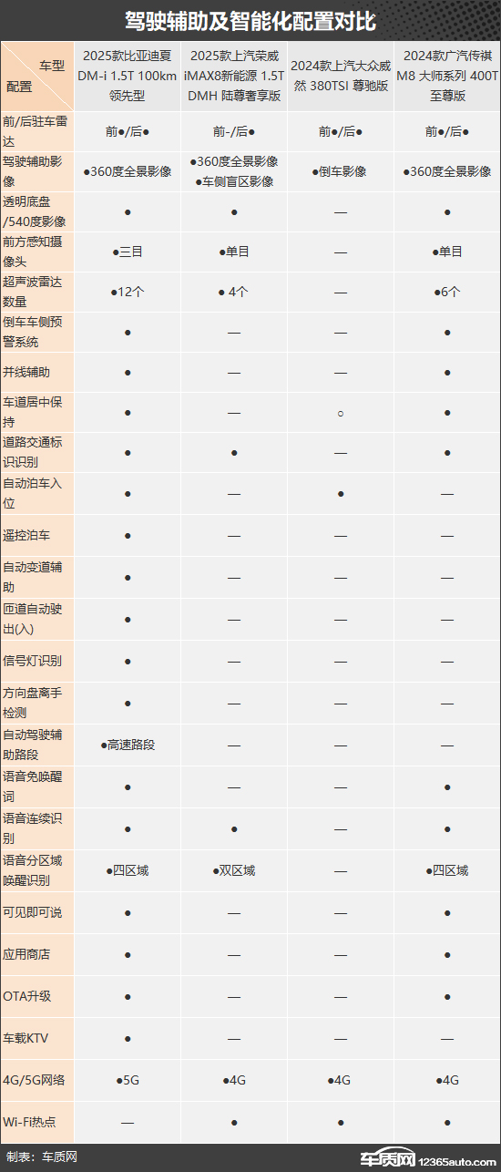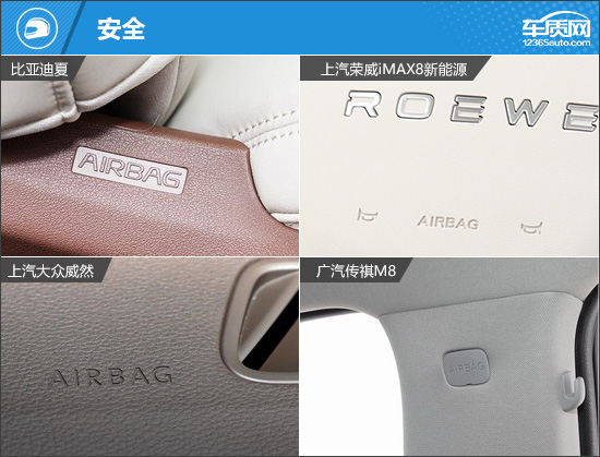 内部配置方面,荣威iMAX8和传祺M8旗鼓相当,但侧重点有所不同。其中,荣威iMAX8的优势在于独享副驾驶位后排可调节按钮和后排小桌板,且座椅功能性配置也比较丰富,可以提供更好的乘坐舒适性。传祺M8则是独享驾驶位电动座椅记忆功能和负离子发生器,在便利性方面略胜一筹。由于比亚迪夏参与对比的为入门车型,在舒适性配置方面存在明显缺失,特别是在座椅功能方面,与另外三款车型有一定差距。