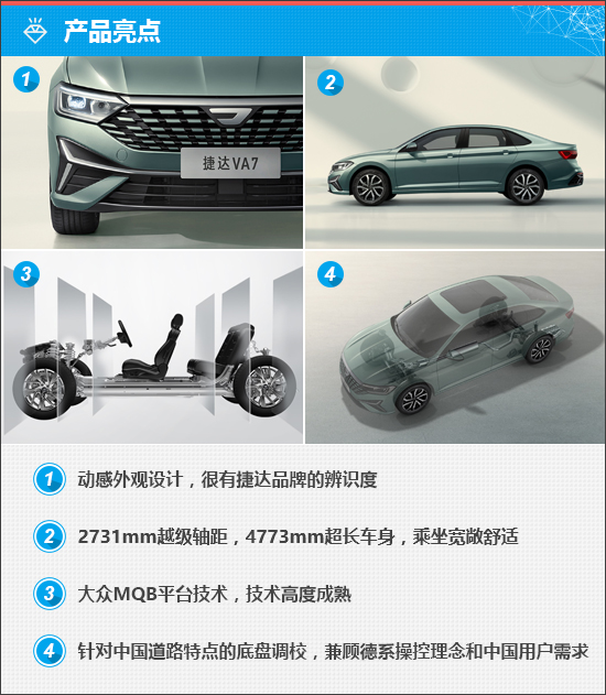 捷达VA7具体长宽高为4773mm*1789mm*1469mm,轴距为2731mm,整车长度“得房率”同级领先,最大化提升了内部空间,可为乘客提供宽敞舒适的乘坐体验。尤其针对中国用户喜欢的第二排,更是提供了充足的腿部空间,确保不同体型乘客的乘坐舒适度。