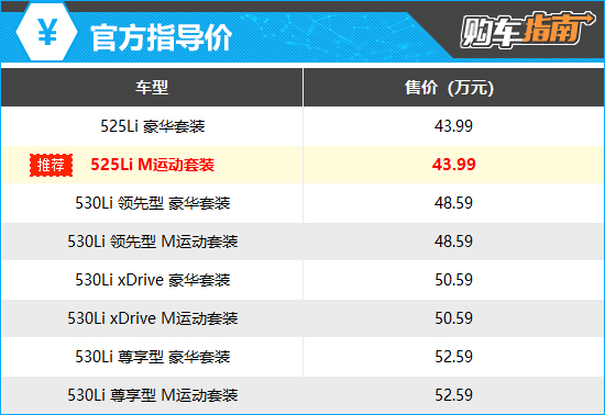 2025款华晨宝马5系共推出8款车型,售价区间为43.99-52.59万元。新车依旧推出豪华套装和M运动套装两种外观套件以及两种动力版本供消费者选择。