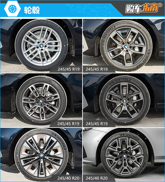 轮毂方面,2025款华晨宝马5系提供7种轮毂样式,分别是19英寸铝合金轮毂,三合一轮辐933型,银色;19英寸铝合金轮毂,双辐式样935M型,黑灰双色;19英寸空气动力学轮毂,934型轮辐,双色灰;20英寸空气动力学轮毂,937型轮辐,银色;20英寸M型空气动力学轮毂,939M型轮辐,黑灰双色;19英寸空气动力学轮毂,934型轮辐,泰坦金;20英寸空气动力学轮毂,937型轮辐,泰坦金。除顶配和次顶配车型标配20英寸轮毂外,其余车型均标配19英寸轮毂(部分轮毂图片有缺失)。