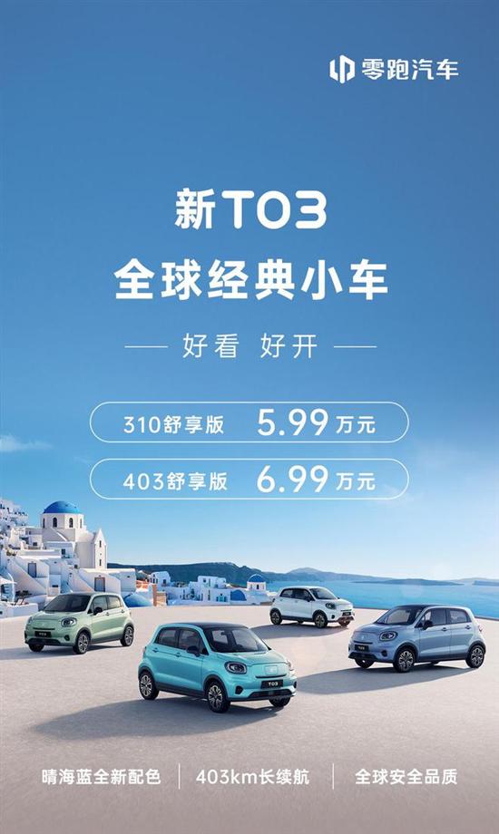 零跑汽车新T03五门纯电小车正式上市,新车共推出2款车型,分别为310舒享版和403舒享版,售价为5.99万元和6.99万元。此外,从即日起至2025年2月28日,零跑汽车将为新T03用户提供6重购车好礼,至高可节省30680元,且承诺为首任车主(非营运)提供三电终身质保。