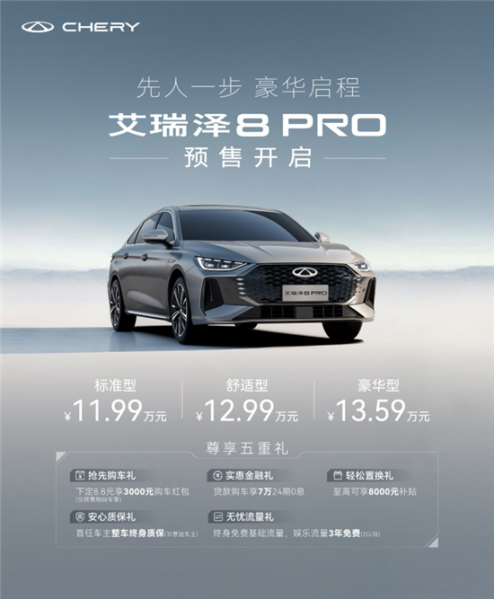 3月1日,备受期待的“高性能豪华家轿”艾瑞泽8 PRO正式开启预售,新车共推出三款车型,预售价格为标准型11.99万元、舒适型12.99万元、豪华型13.59万元。与此同时,艾瑞泽8 PRO还推出了尊享五重礼,让更多用户轻松享受美好用车生活。