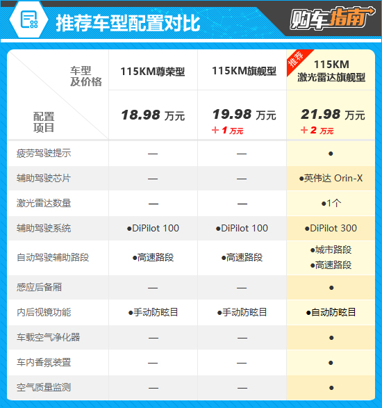指导价为21.98万元的115KM激光雷达旗舰型是本次的推荐车型。通过配置对比可以看出,推荐车型是唯一一款搭载DiPilot 300(天神之眼B)高阶辅助驾驶系统的车型,独占了英伟达 Orin-X辅助驾驶芯片和1个激光雷达,智驾能力更强,并支持城市领航10大场景,全国城区都能开,是真正做到行泊一体的全场景高阶智驾。值得一提的是,拥有全场景高阶智驾能力的中型SUV,售价普遍在25万元左右,而115KM激光雷达旗舰型的售价不到22万元,性价比出色。此外,推荐车型还独占了疲劳驾驶提示、感应后备厢、自动防眩目内后视镜等实用功能,能够进一步提升日常用车的安全性和便利性。