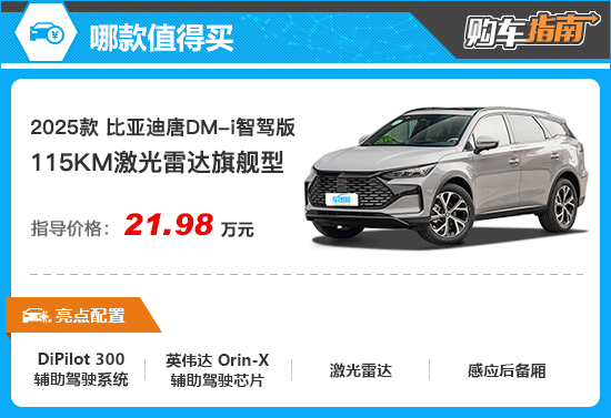 因此,对于比亚迪唐DM-i智驾版的购买建议,重点推荐指导价为21.98万元的115KM激光雷达旗舰型,消费者在购买时可优先考虑。
