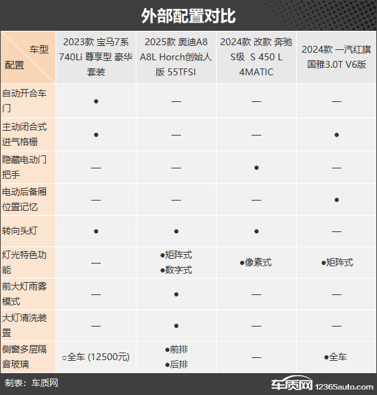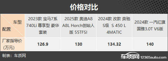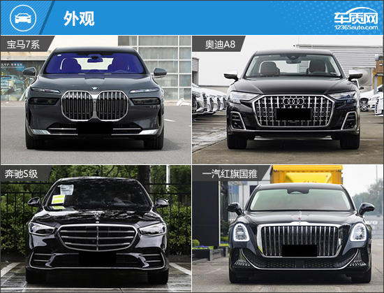 此次我们推荐的四款车型分别是2023款 宝马7系 740Li 尊享型 豪华套装(以下称:宝马7系)、2025款 奥迪A8 A8L Horch创始人版 55TFSI(以下称:奥迪A8)、2024款 改款 奔驰S级 S 450 L 4MATIC(以下称:奔驰S级)和2024款 一汽红旗国雅3.0T V6版(以下称:红旗国雅),四款车型的轴距超过3200mm且价格比较接近(由于目前图片数量较少,因此部分车型的图片并不是相对应的具体款型)。